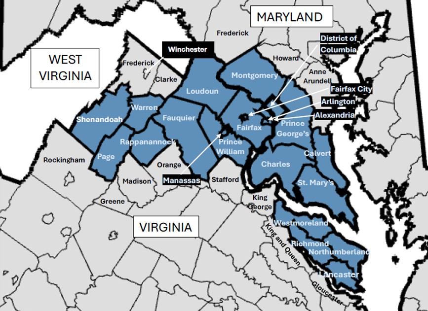 Manassas, and Alexandria cities), Washington, D.C., and southern